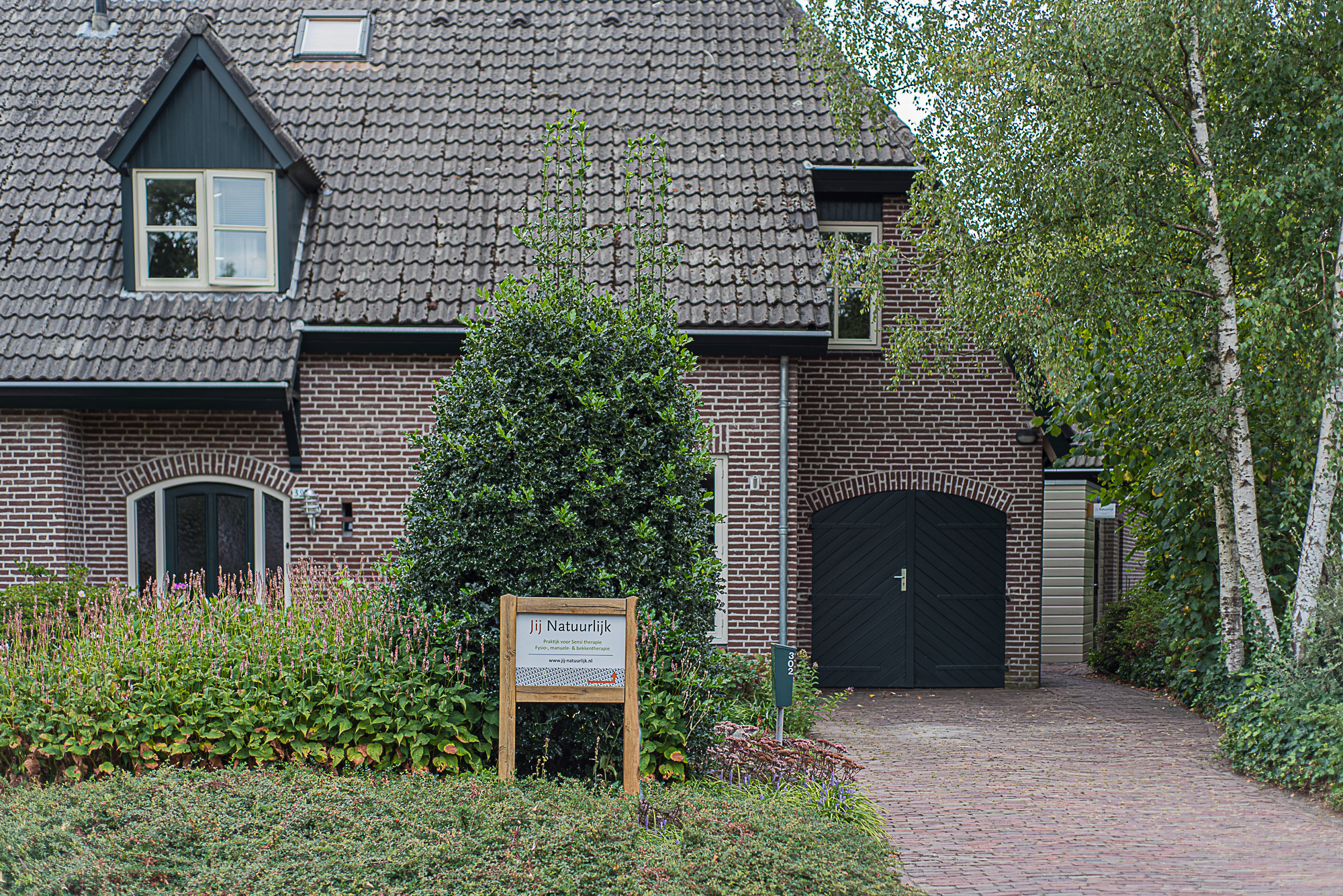 De ingang van de praktijk bevindt zich aan de rechter zijkant van het huis.